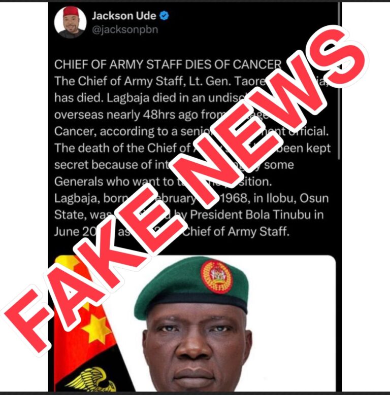 The Nigerian Army has dismissed the rumoured death of the Chief of Army Staff (COAS), Lt.-Gen. Taoreed Lagbaja, by some individuals on social platforms.