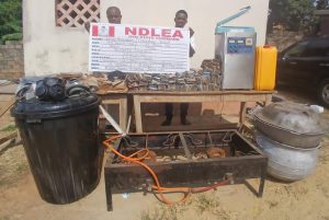 Also in Ibadan, a drug kingpin Jimoh Nurudeen, 40, who owns a facility where he produces Colorado, a synthetic cannabis, was on Saturday 7th February arrested at Badeku area of Ibadan, along with his accomplice Ogundipe Yusuf, 27. Recovered from them include: 8 litres of precursor chemical; 14 grams of skunk and other paraphernalia of Colos production, as well as monetary exhibit of ₦7,408,400.00 and two vehicles: a Mercedes Benz SUV marked ABC 832 AZ and a Toyota Highlander with registration number RBC 243 BS.
