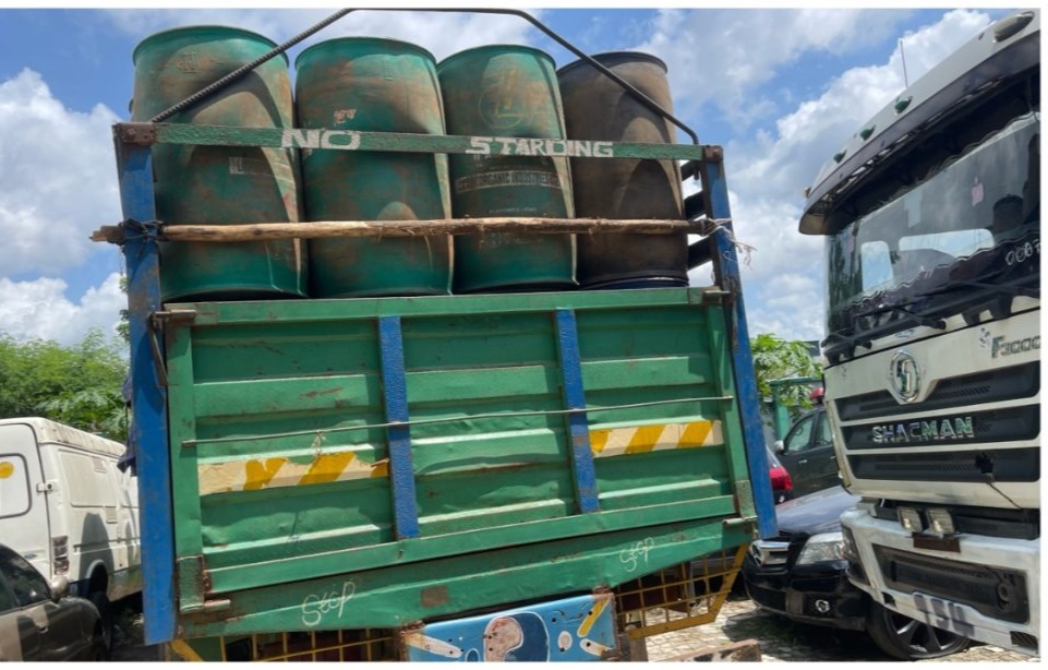 “Seventy-seven drums of PMS (66 kegs of 25 litres each) equivalent to 15.400 litres at SEAYAB PETROLEUM along Imeko /Obada road in Ogun state. The means of conveyance is a truck with the Reg. No 9504244D. Friday 7th of June, 2024.