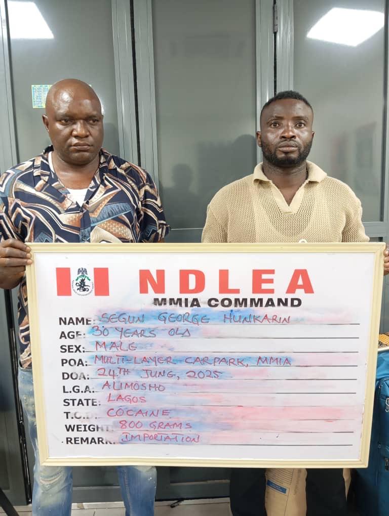 Operatives of the National Drug Law Enforcement Agency (NDLEA) have arrested an ex-international football player Segun George Hunkarin along with his businessman partner Ntoruka Emmanuel Chinedu over attempt to smuggle a consignment of cocaine into Nigeria through the Murtala Muhammed International Airport,(MMIA) Ikeja, Lagos.