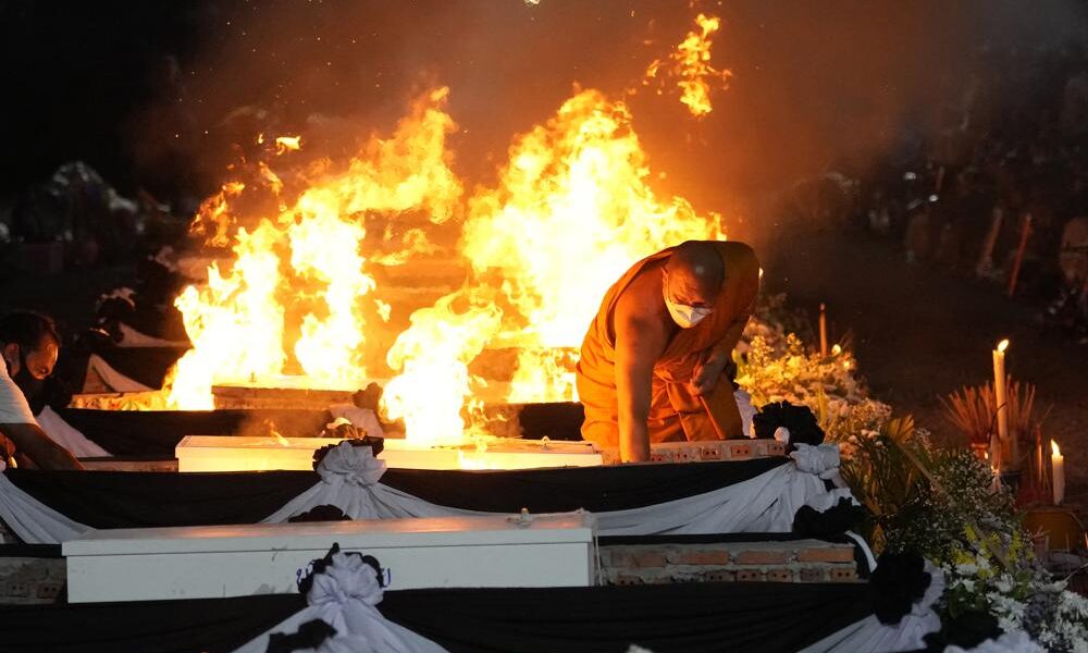 Buddhist chants played from a speaker system set up behind the relatives, as the officials and monks began lighting the pyres one by one. The coffins were soon engulfed by flames, at times stoked by the officials adding more gasoline. The victims’ relatives sat silently by, hands clasped in prayer.