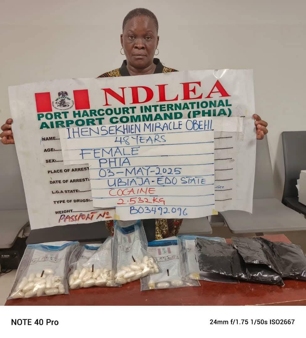 Obehi who was dressed in hijab to beat security checks was intercepted at the departure hall of the Port Harcourt airport on Sunday 3rd May 2025 while trying to board a Qatar Airline flight to Iran via Doha following credible intelligence. During her search, she was found to have inserted three wraps of cocaine in her private part, and two large parcels hidden in false compartments of her handbag while she swallowed 67 pellets of the Class A drug.