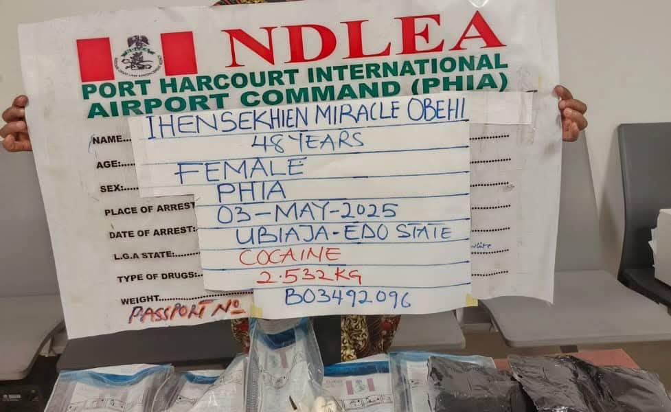 Obehi who was dressed in hijab to beat security checks was intercepted at the departure hall of the Port Harcourt airport on Sunday 3rd May 2025 while trying to board a Qatar Airline flight to Iran via Doha following credible intelligence. During her search, she was found to have inserted three wraps of cocaine in her private part, and two large parcels hidden in false compartments of her handbag while she swallowed 67 pellets of the Class A drug.