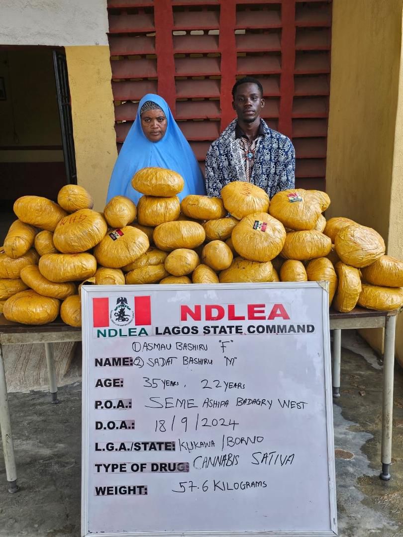 Though Alhaji Talba is currently at large, a search of his house in Ashipa area of Seme Badagry led to the recovery of 93 compressed blocks of cannabis sativa weighing 57.6kg from his first wife, Asma’u Bashiru, 35, and son, Sadat Bashiru, 22, while another search of his house at Aketegbo area of Seme Badagry led to the seizure of 302 compressed blocks of cannabis weighing 168.6kg from his second wife Hauwa Bashir, 42.