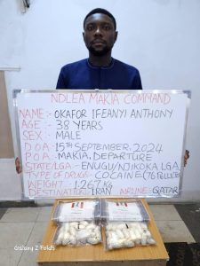 At the Mallam Aminu Kano International Airport (MAKIA), Kano, NDLEA operatives on Sunday 15th September arrested a 38-year-old drug mule, Okafor Ifeanyi Anthony while attempting to board a Qatar Airlines flight to Iran via Doha with 76 wraps of cocaine in his stomach. After three days in excretion observation, Okafor excreted the 76 pellets of the ingested cocaine weighing 1.267kg.