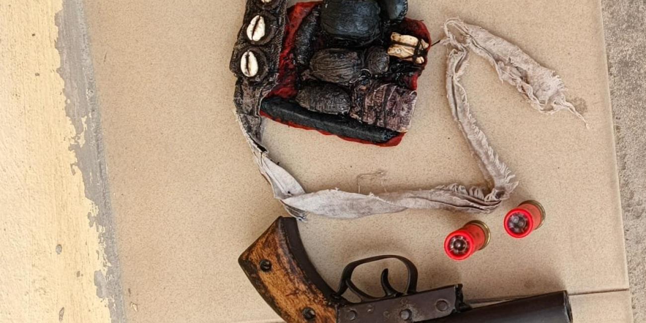 The suspects were apprehended during a police operation that led to the recovery of a locally made double-barrel pistol, two live cartridges, and a black bag containing charms.