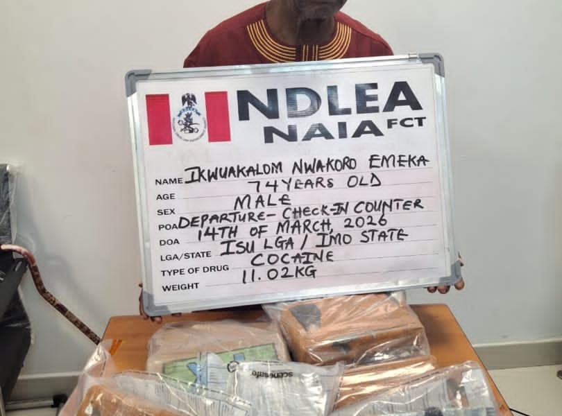 The septuagenarian who claimed he was travelling to London, United Kingdom for vacation, was arrested by NDLEA officers at the departure hall of the Abuja airport while attempting to board a British Airways flight BA082 to Heathrow London on Saturday 14th March 2026.